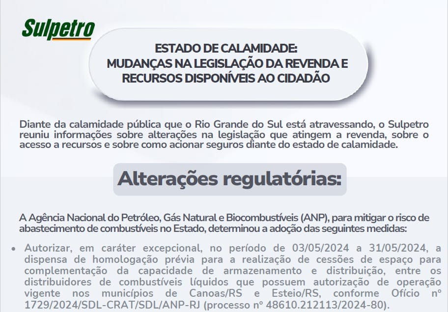 09/05 – Sulpetro elabora Cartilha do Estado de Calamidade, para auxiliar revenda atingida pelas inundações.
